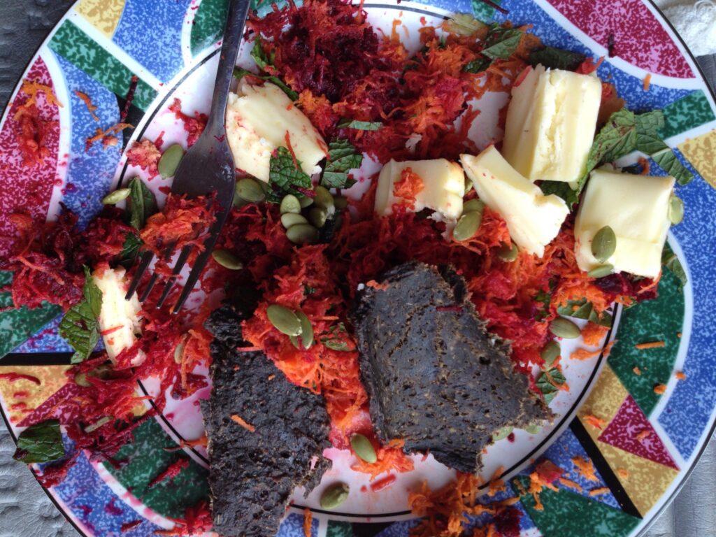 1–Grate the carrots and beets on a cutting board and scoop onto your plate or a mixing bowl.
