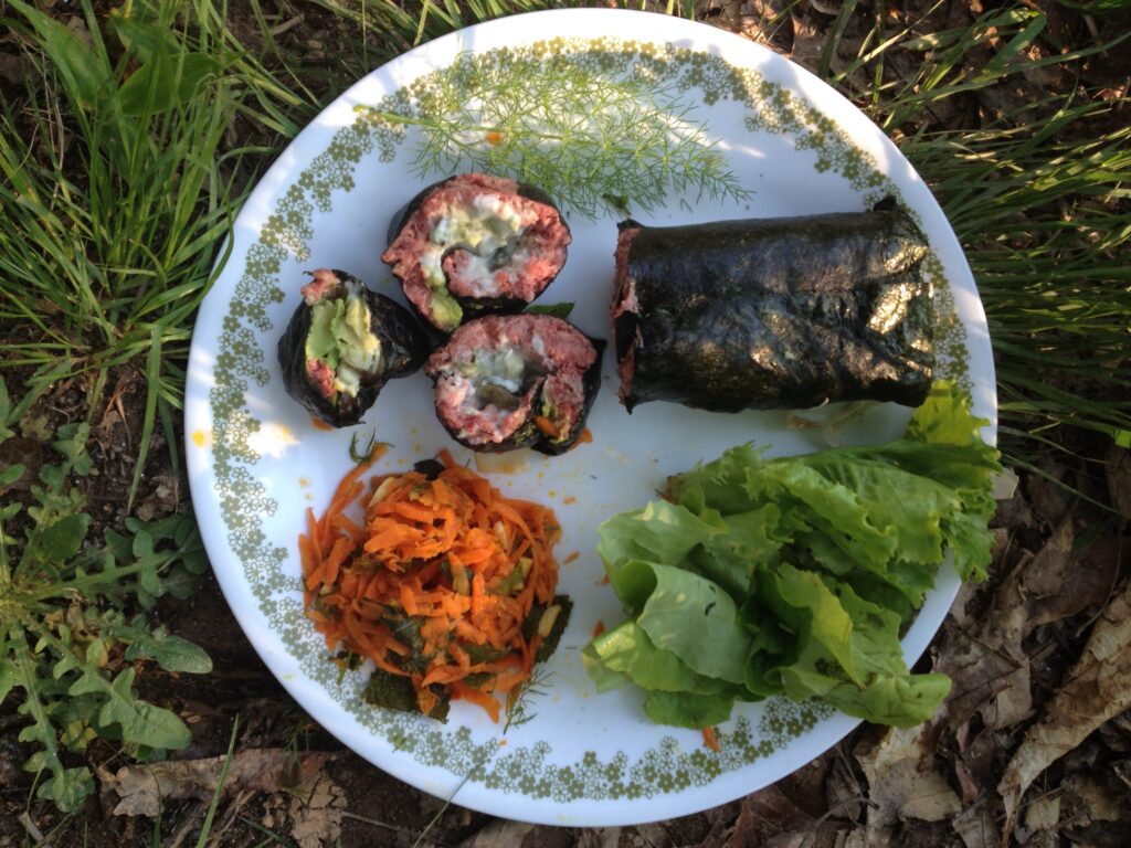 2–Spread some raw ground beef on nori roll (about 1/2′ thick). Leave the front and back edge clear by about an inch.